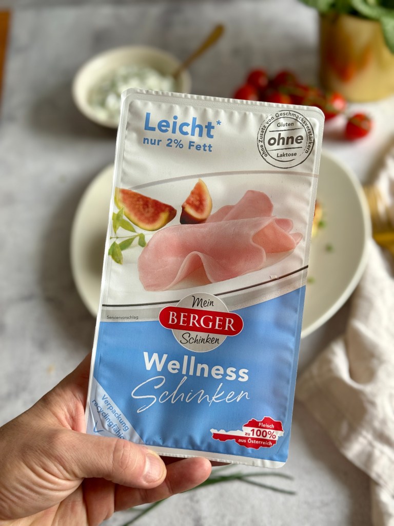Bei der Wahl des Schinkens habe ich mich diesmal für den leichten, puristischen Wellness Schinken von Berger Schinken entschieden. Der einfache Wellness-Schinken ohne viel Schnickschnack, mit nur 2% Fett, passt zum neuen, leichten Lebensgefühl und erfüllt den Wunsch nach einer bewussteren Ernährung in jeder Hinsicht und das bei 100% Geschmack.