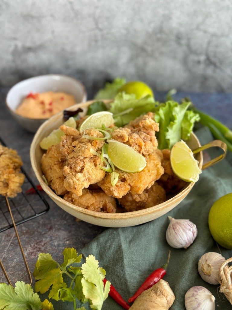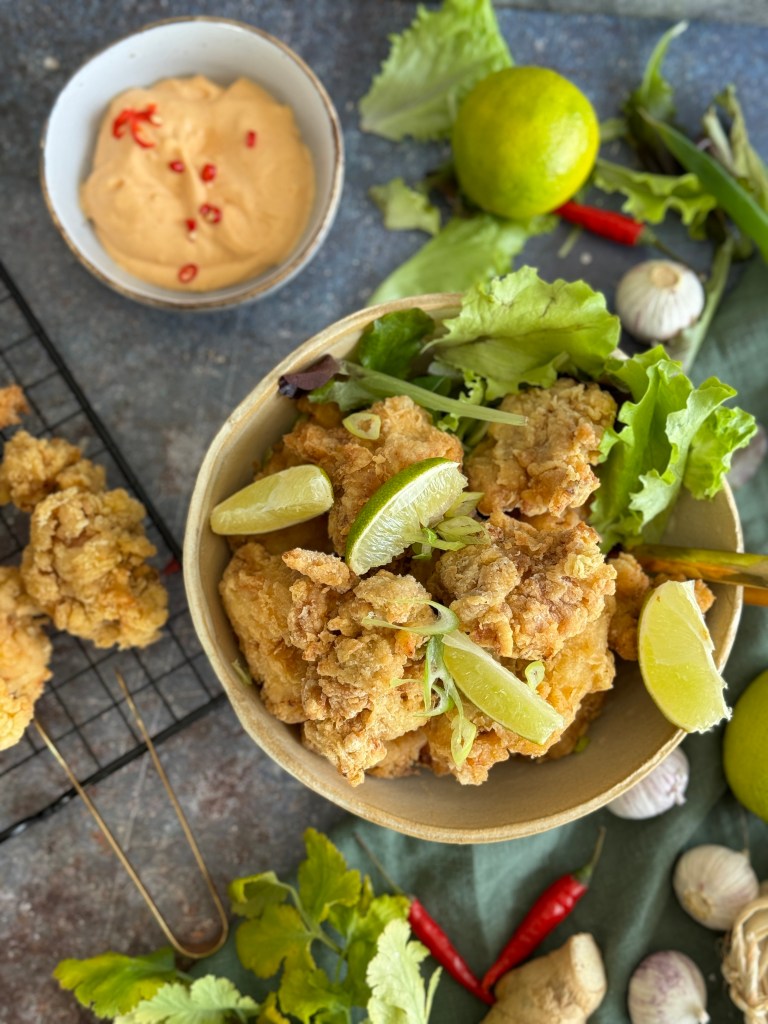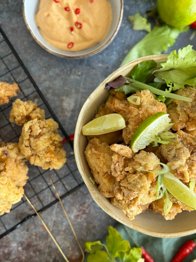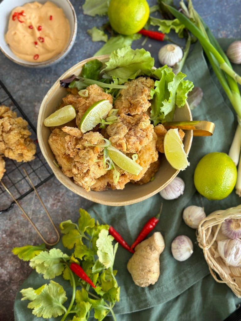 Was ich euch vorweg schon gleich verraten kann: achtet wirklich darauf, dass ihr unbedingt Oberkeulenfleisch vom Huhn verwendet. Dieses ist gut durchwachsen und wird, im Gegensatz zur Brust, beim Frittieren nicht trocken.