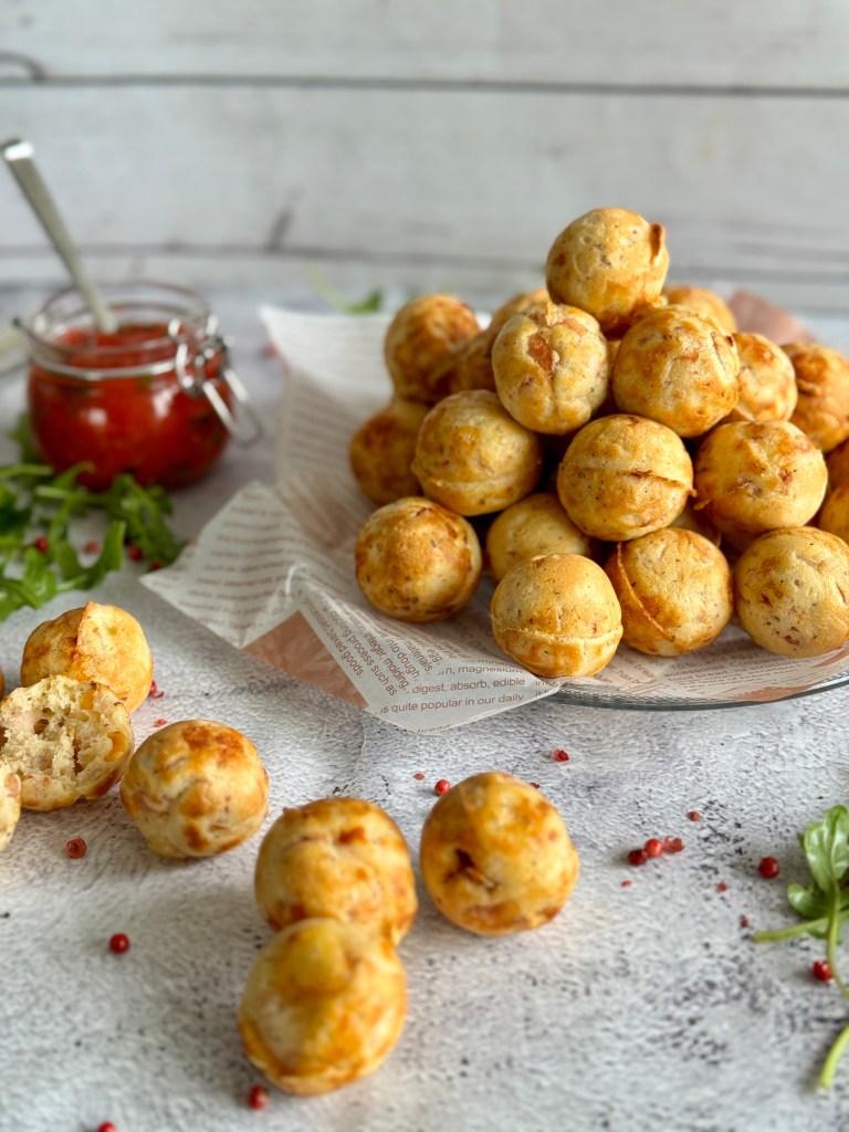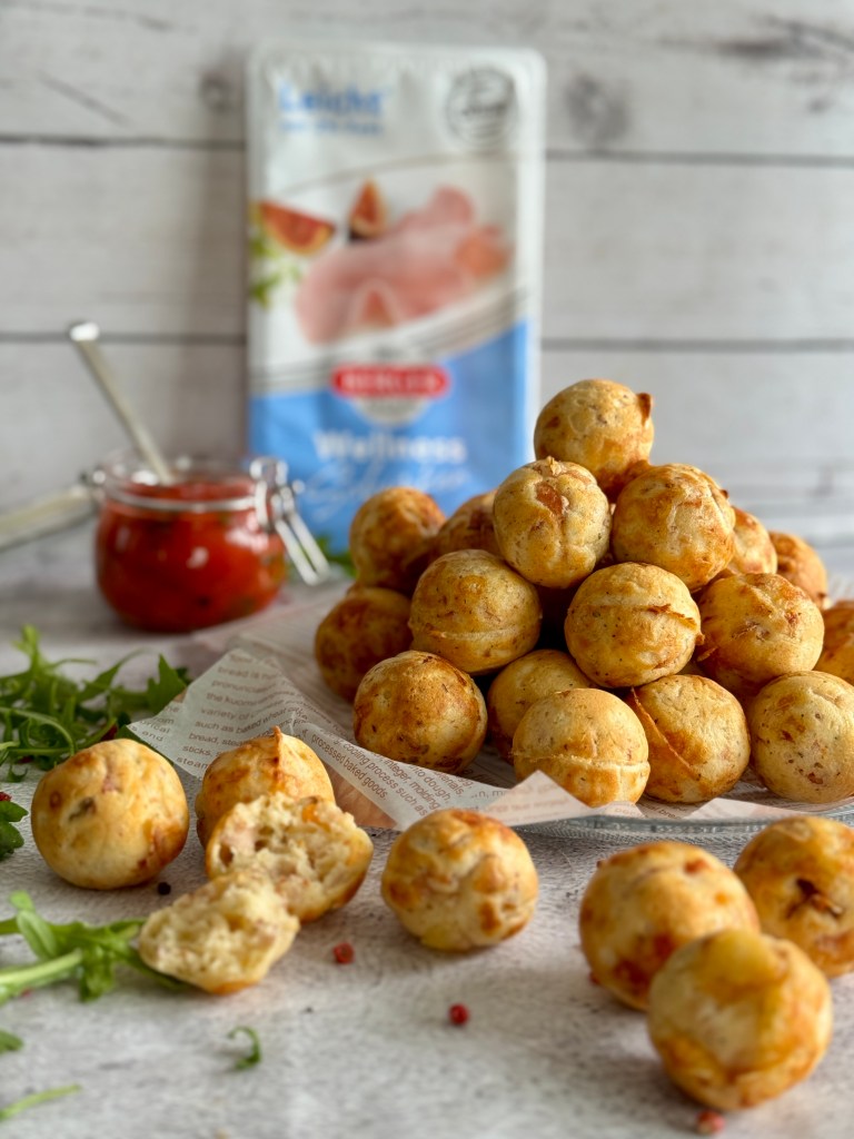 Ich verfeinere den leckeren, leichten Schinken mit aromatischen, getrockneten Tomaten für den mediterranen Flair, köstlichem Käse und Kräutern. Um kleine Bällchen formen zu können, verwende ich einen Cake-Pop Maker. Habt ihr keinen, könnt ihr auch kleine Muffins im Backrohr backen oder mit dem Löffel in der Pfanne backen.