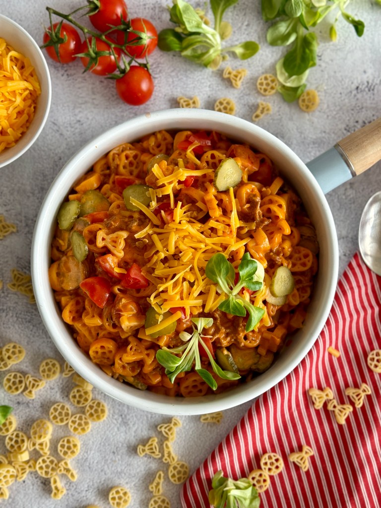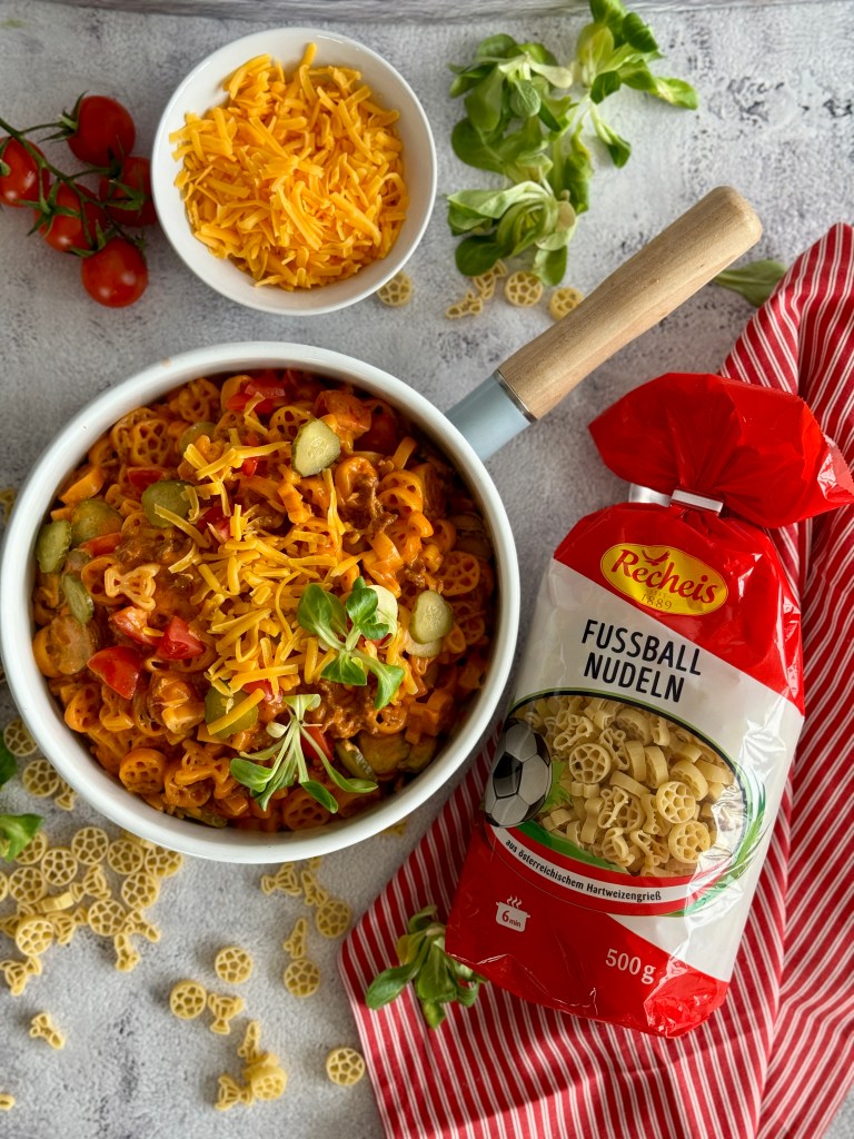 In diesem Rezept zeige ich euch den Burger Klassiker in einer Nudelvariante. Die Fussball Nudeln müssen dabei nicht einmal vorgekocht werden. Das macht es zu einem einfachen One-Pot Gericht. Wie es gemacht wird, liest du weiter unten.