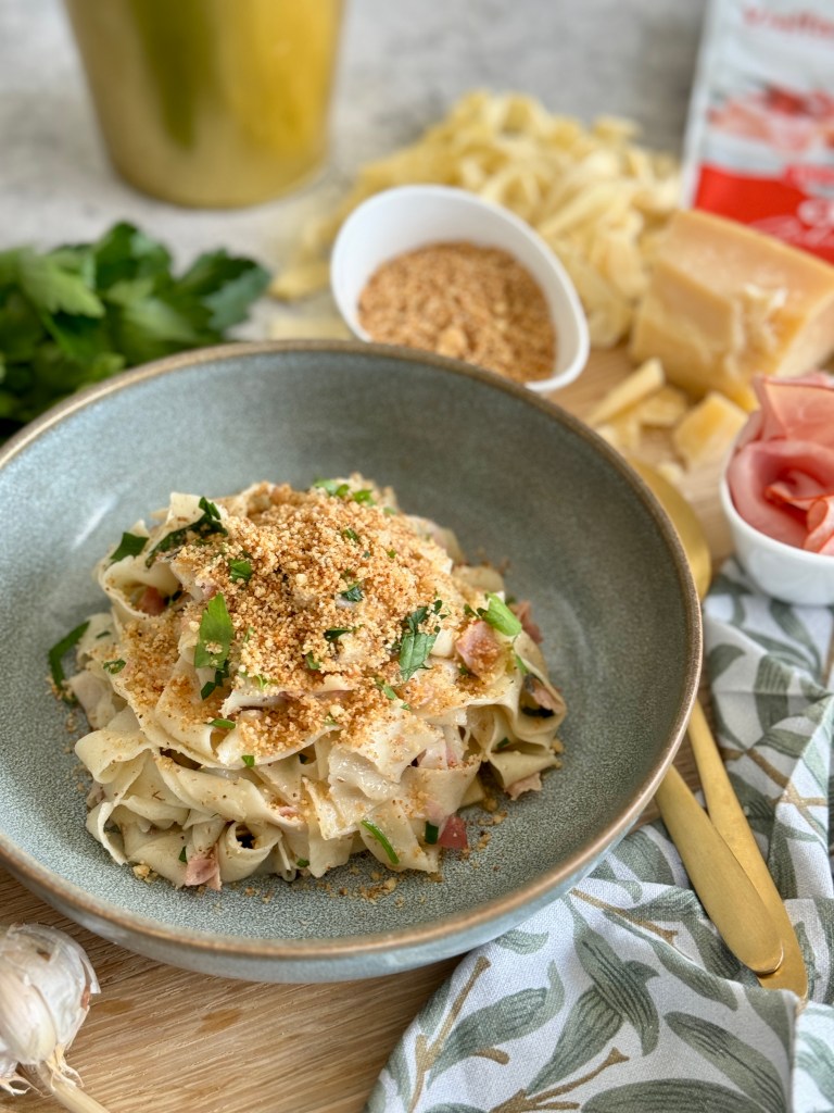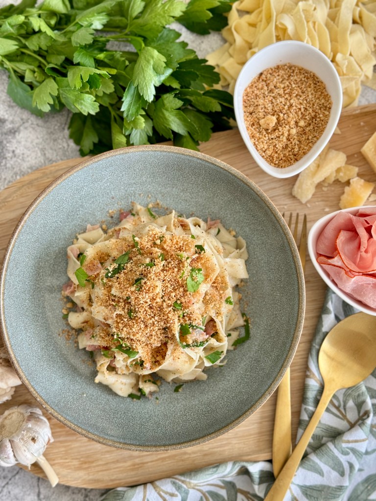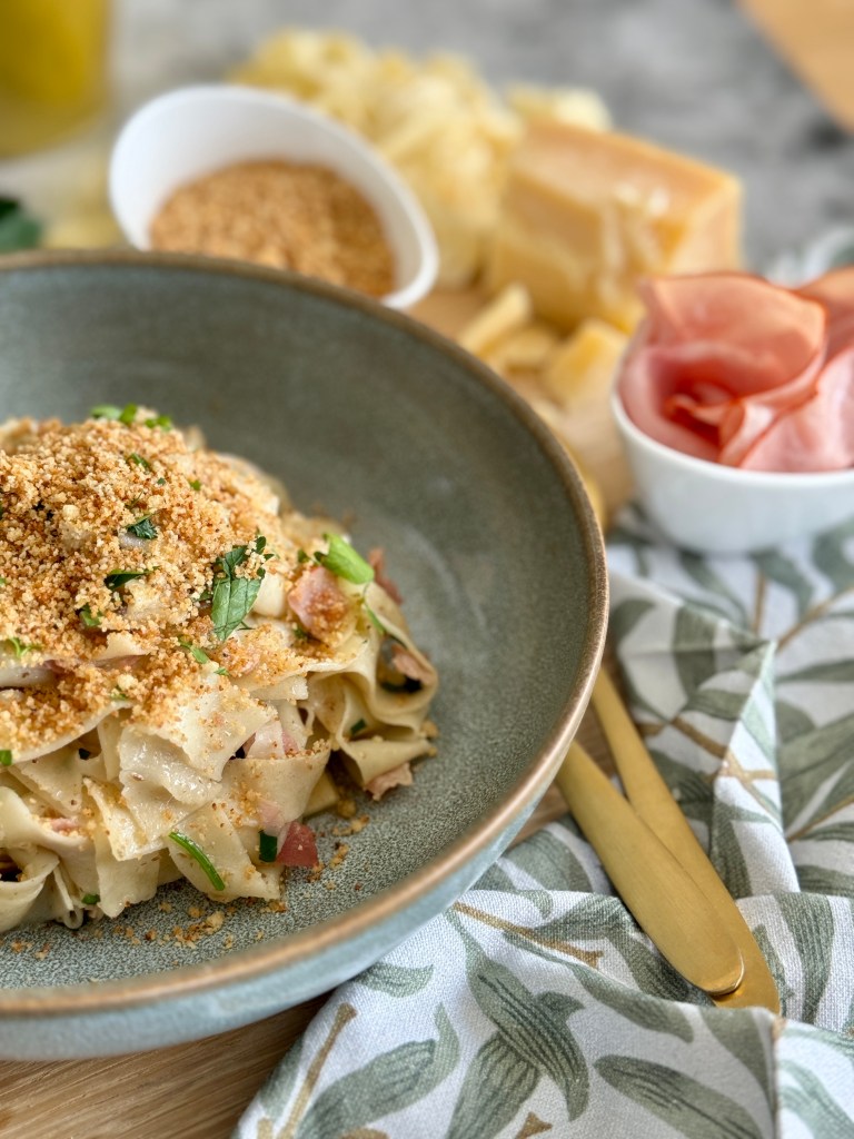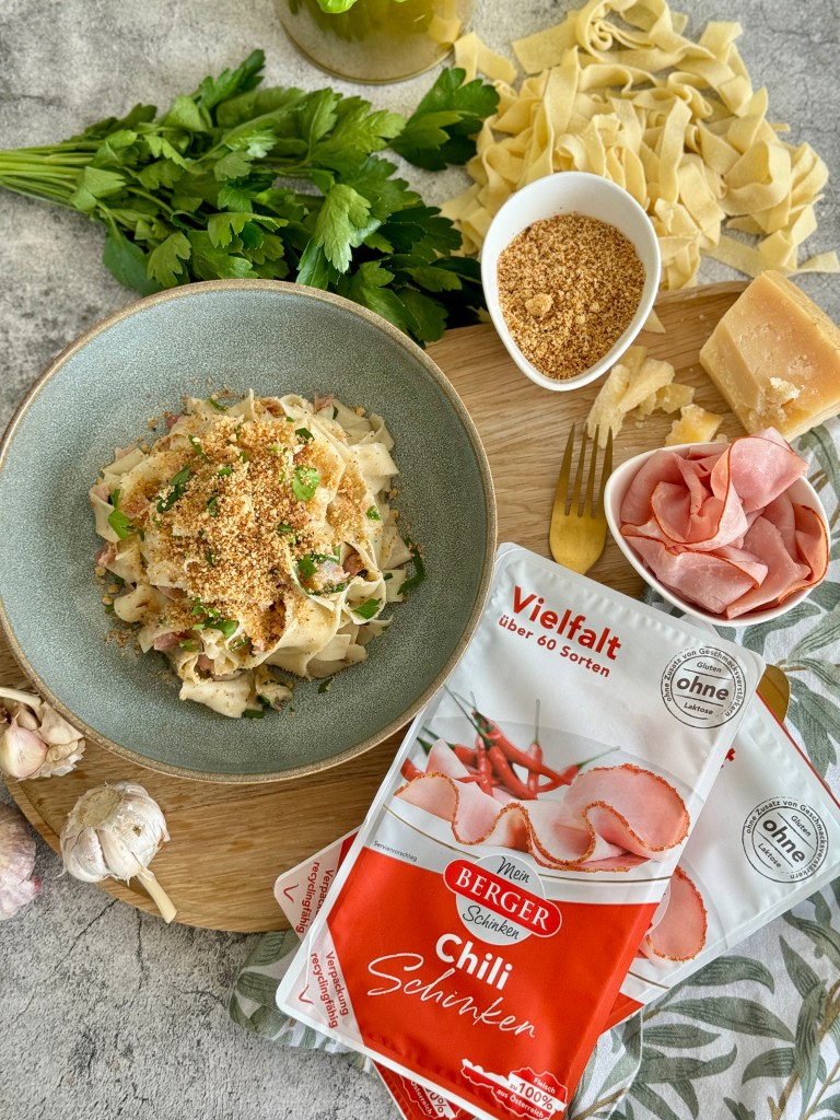 Laut italienischem Originalrezept ist kein Schinken mit dabei, aber ich dachte mir, so eine leichte Chilinote mit Schinken kann nicht schaden. Und ja , was soll ich sagen? Ich habe es umgestylt und meine Pasta con la mollica schmeckt unglaublich lecker.