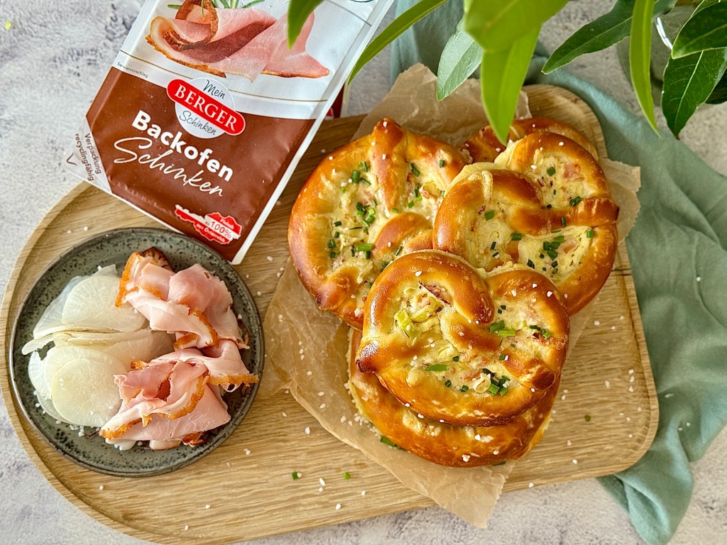 Für die Füllung habe ich den aromatischen Backofenschinken von Berger verwendet. Der zarte Schinken sorgt für eine extra Portion Geschmack und harmoniert wunderbar mit der cremigen Flammkuchen-Masse. Ein echter Genuss, der die Brezen zu einem Highlight auf jeder Wiesn-Party macht!