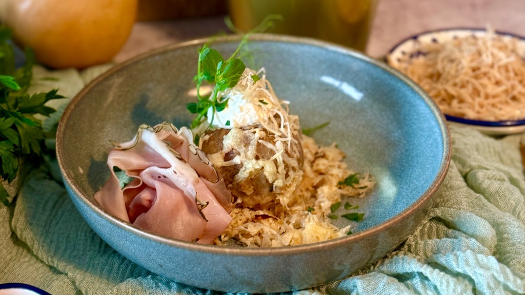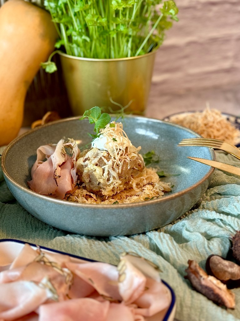 Und dann können die saftigen Schinkenbrot Knödel schon serviert werden. Ich würde noch etwas Sauerrahm als Dip dazu empfehlen. Und sollten euch Knödel übrig bleiben, kann man diese Rest’l auch verwerten: Geröstete Knödel mit Ei, eines meiner Lieblingsspeisen, kann man immer machen.