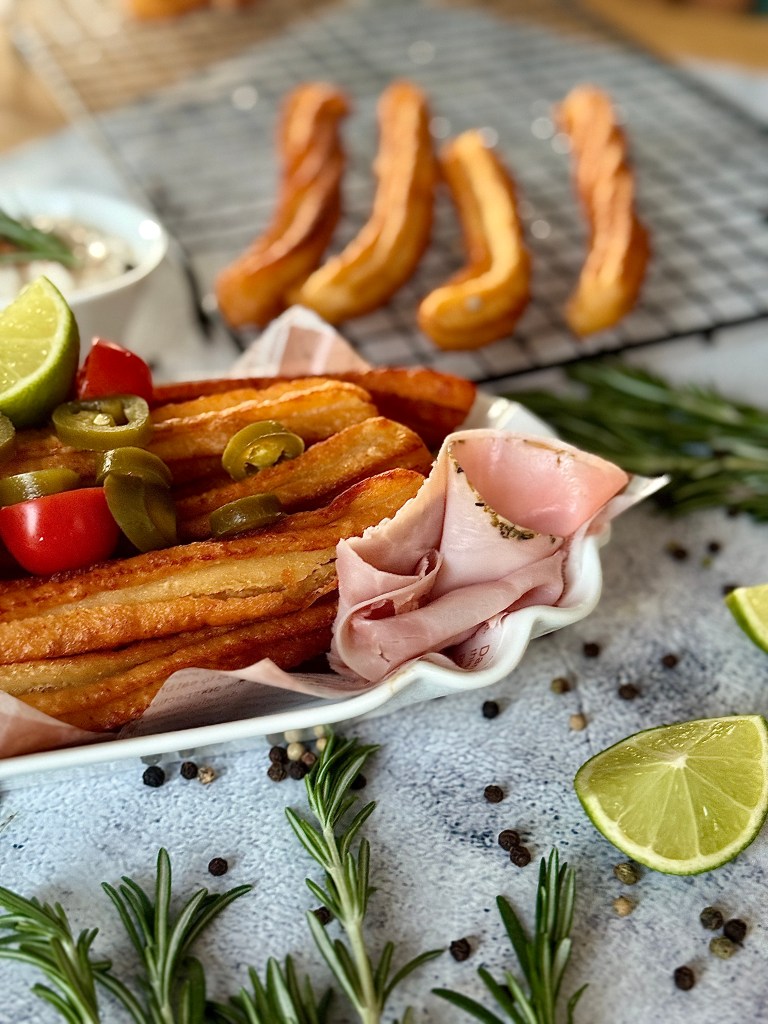 Wie gesagt: „Churros müssen nicht immer süß sein!“ In meiner Variante kombinieren wir würzigen Käse mit dem aromatischen Rosmarin-Schinken von Berger Schinken – ein Snack, der garantiert für Begeisterung sorgt. Außen knusprig, innen weich und voller Geschmack – perfekt für gesellige Abende oder als besondere Beilage.