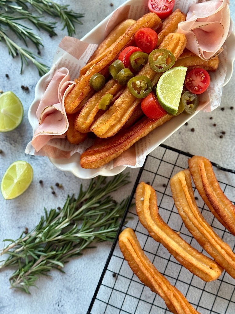Jetzt sind deine herzhaften Churros mit Käse & Rosmarin-Schinken fertig und bereit zum Genießen! Egal wie ihr sie anrichtet – sie bringen garantiert mediterranes Flair auf den Tisch. Lasst es euch schmecken und genießt diese einzigartige Köstlichkeit!