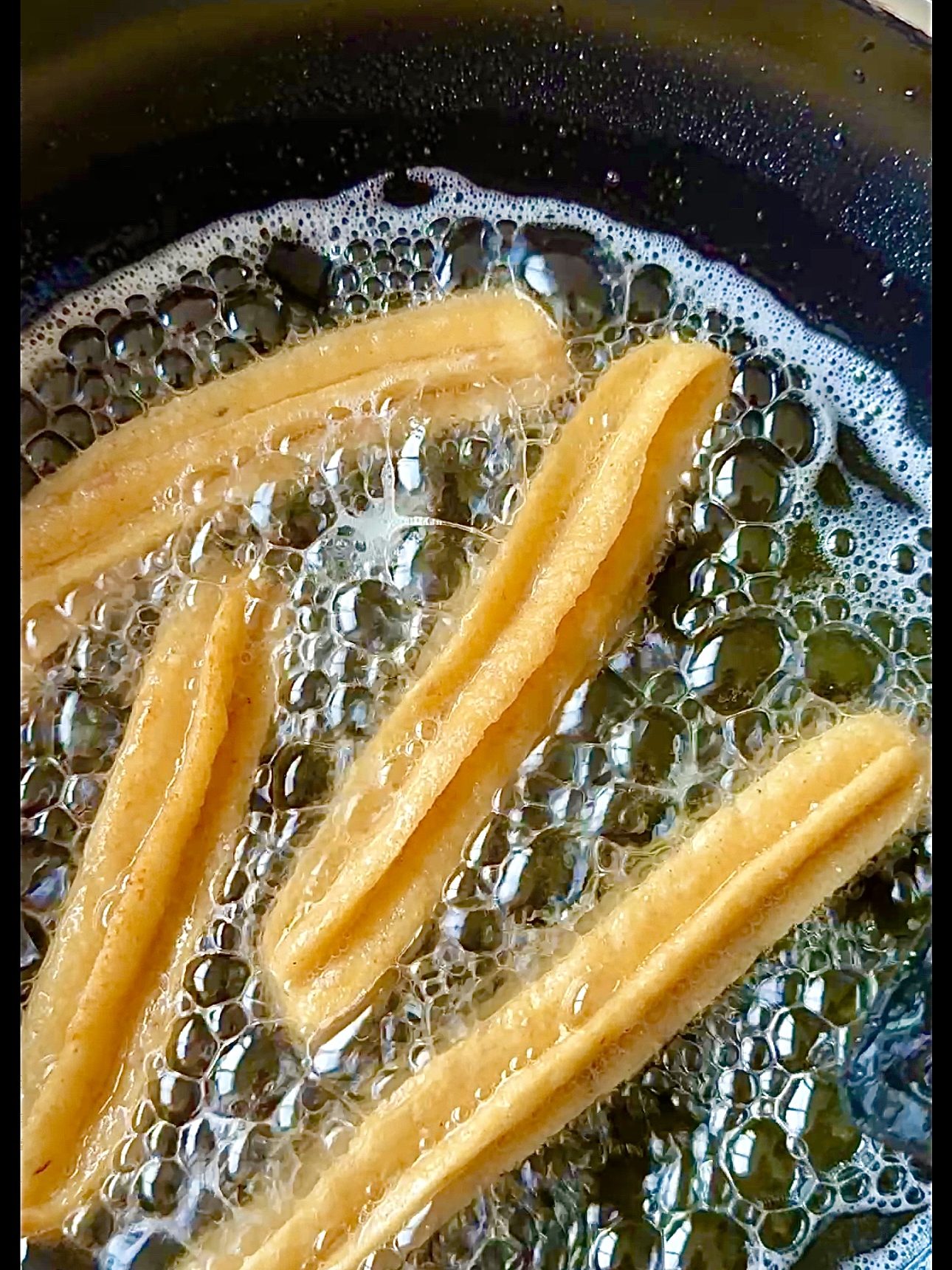 Während der Teig ruht, erhitzen wir ausreichend Öl in einem Topf auf etwa 190 °C. Sobald das Öl heiß ist, füllen wir den Teig in einen Spritzbeutel mit Sterntülle. Nun spritzen wir etwa zehn Zentimeter lange Streifen direkt ins heiße Fett und backen sie goldbraun aus. Dabei wenden wir sie vorsichtig, damit sie von allen Seiten gleichmäßig knusprig werden.
