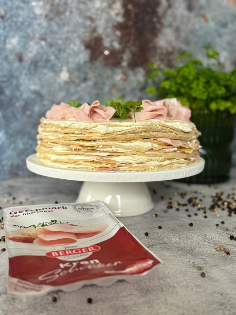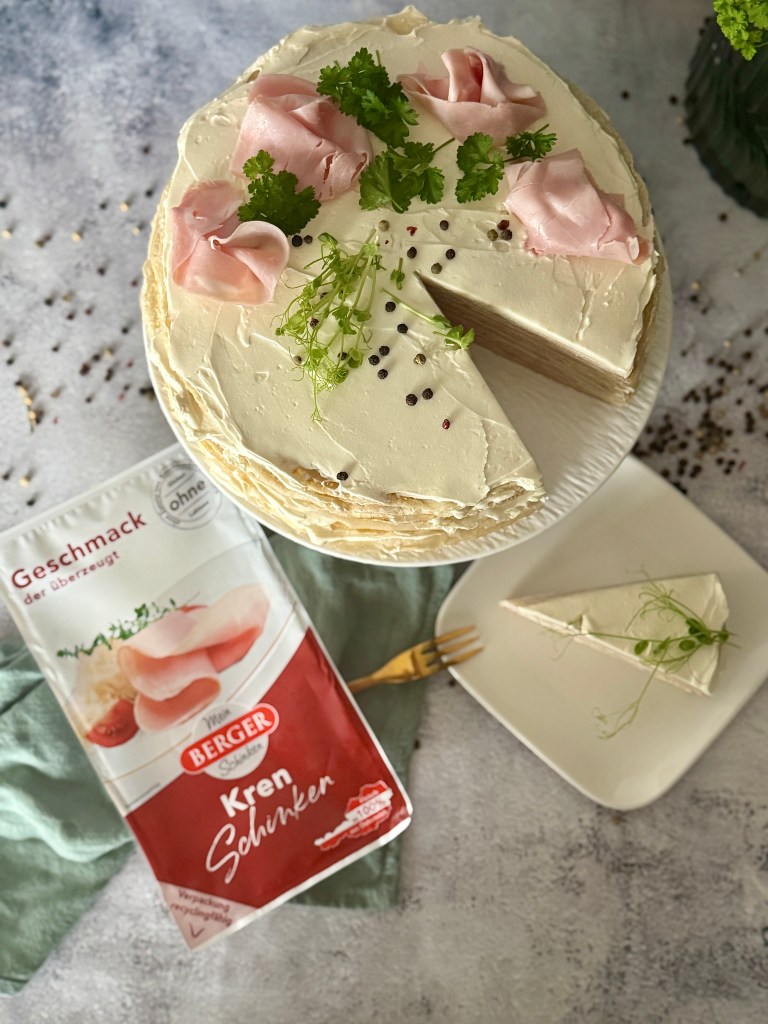 Palatschinken sind ein echtes Wohlfühlessen – dünn ausgebacken, herrlich vielseitig und in Österreich quasi Kult. Normalerweise kennt man sie süß, mit Marmelade oder Schokolade bestrichen, aufgerollt oder kunstvoll geschichtet. Doch heute bekommt die Palatschinken-Torte einen neuen Twist: herzhaft, cremig und würzig, mit einer feinen Frischkäsecreme und dem unverwechselbaren Kren-Schinken von Berger.