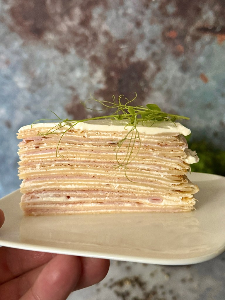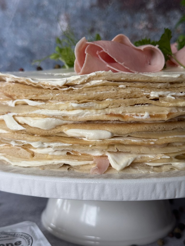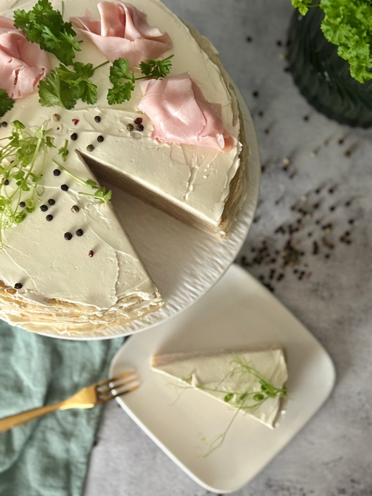 Auf eine Tortenplatte kommt die erste Palatschinke, dünn bestrichen mit der Frischkäsecreme. Dann folgen zwei weitere Schichten – ebenfalls mit Creme bestrichen – bevor die nächste Etage mit Kren-Schinken belegt wird. Dieses Muster wiederholt sich: drei Schichten mit Creme, dann eine mit Schinken. Das sorgt dafür, dass der Geschmack des Schinkens sich schön gleichmäßig über die ganze Torte verteilt, ohne zu dominant zu sein.