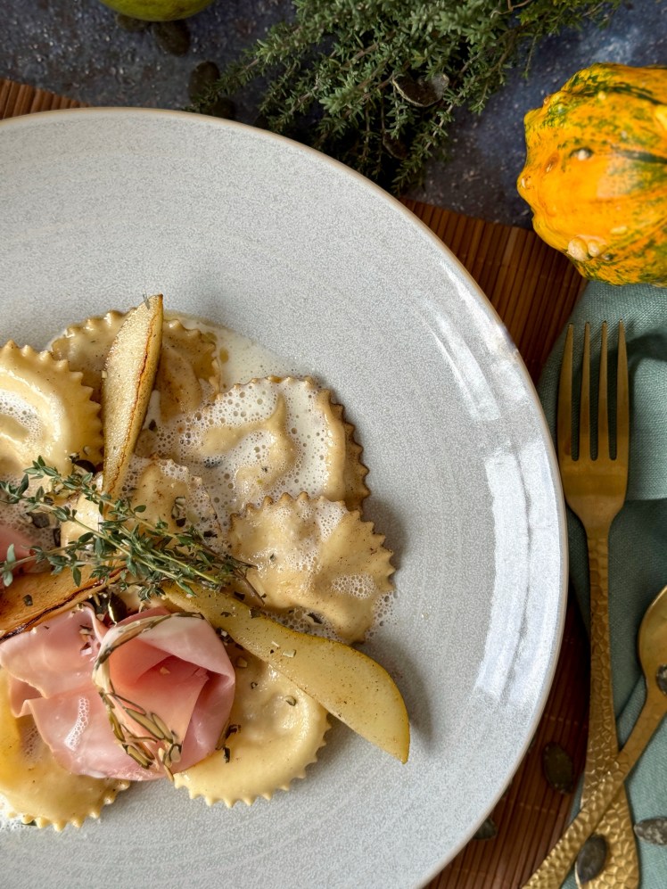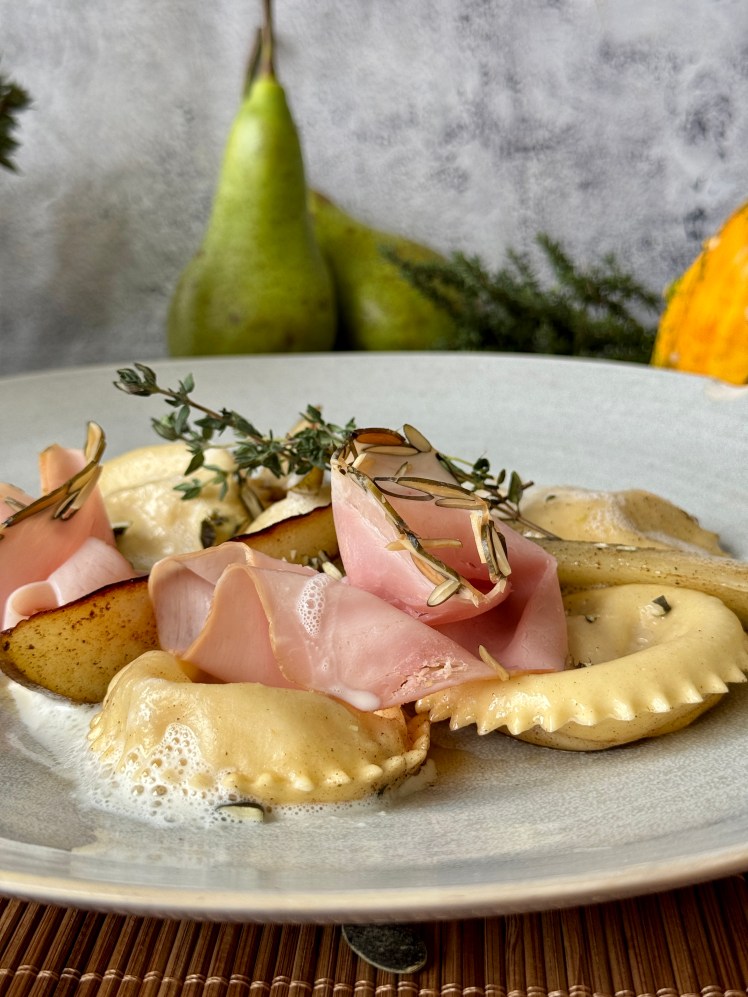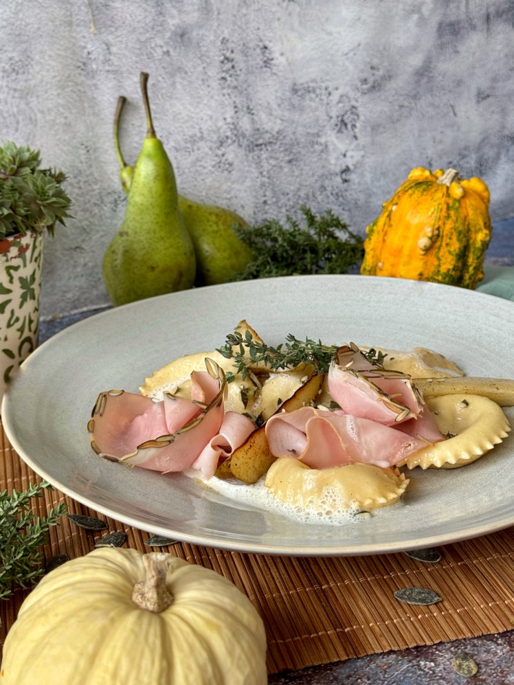 - Birnen-Ravioli mit Kürbiskernschinken und Buttermilchschaum – herbstliche Pasta mit österreichischem Twist