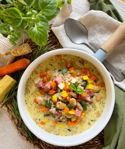 - Kokos-Spargel-Suppe mit Garnelen und Huhn