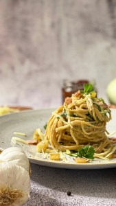 - Karamellisierte Zwiebelpasta mit Chiliöl & Sojasauce