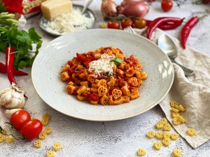 - gesunde Nudelpfanne mit Herz für Wahre Frühlingsgefühle