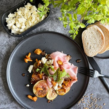 Seien wir uns ehrlich. Bei so einer Sommerhitze steht keiner gerne lange am Herd. Aber immer nur Blattsalat essen ist für mich auch nicht lecker. Deswegen zeige ich euch heute, was man aus frischen Feigen, saftigem Schinken und Fetacrumble zaubern können. Das alles marinieren wir leicht mit Zitrone und dazu gibt es etwas Brot. Als Extra-Topping habe ich noch frische Eierschwammerl genommen, die ich bereits zu Hause hatte. Die Balsam-Reduktion, die dabei entsteht, könnt ihr in einer größeren Menge herstellen und immer wieder verwenden. Lest weiter um mehr zu erfahren. … Mehr Saftig, saftiger, Feigencarpaccio mit Wachauer Schinken und Fetacrumble!